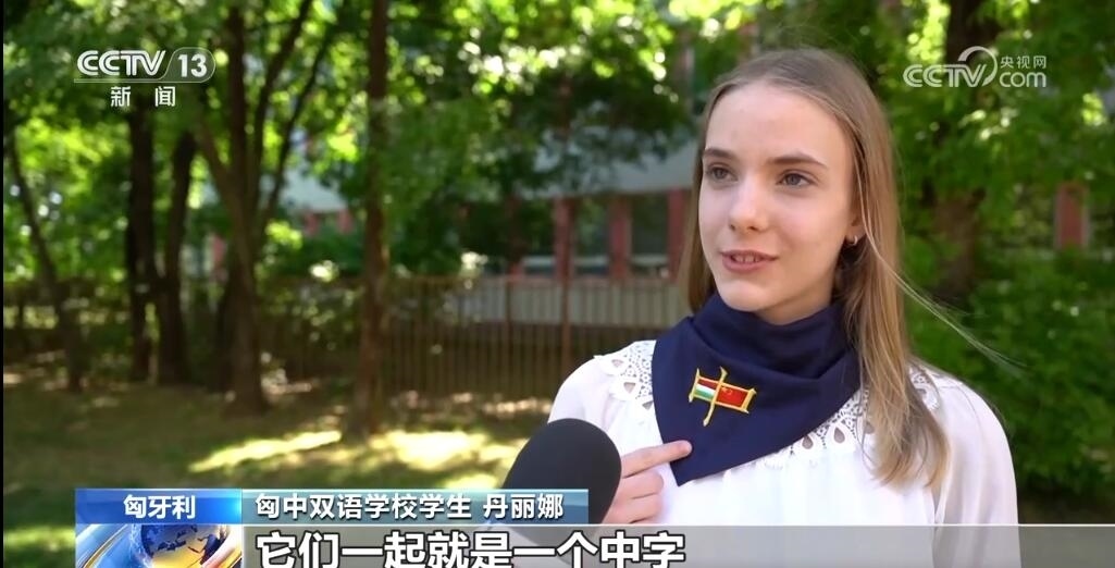 匈中雙語學(xué)校學(xué)生丹麗娜說:“我很開心可以見到他們。我說,您好,我是匈中雙語學(xué)校的丹麗娜,歡迎來到匈牙利。這個領(lǐng)帶上可以看到匈牙利國旗和中國國旗,它們一起就是一個中字,這領(lǐng)帶代表兩個國家的友誼。我學(xué)了10年漢語,將來這個語言會給我打開很多工作的新門。”