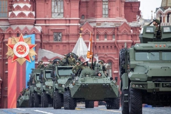 5月9日,在俄羅斯首都莫斯科,軍車編隊駛過紅場。新華社記者曹陽攝