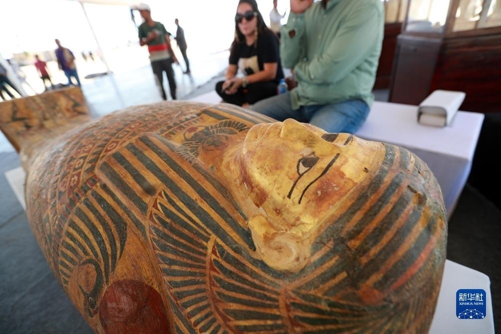 埃及明亞省考古發(fā)現(xiàn)距今約3400年墓地 這是10月15日在埃及明亞省考古現(xiàn)場拍攝的彩繪木乃伊棺......