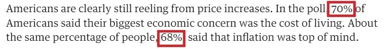 在《衛(wèi)報(bào)》發(fā)布的民意調(diào)查中,有70%的受訪者表示,他們最大的經(jīng)濟(jì)擔(dān)憂是生活成本;大約同樣比例的人(68%)說,通貨膨脹是他們最關(guān)心的問題。