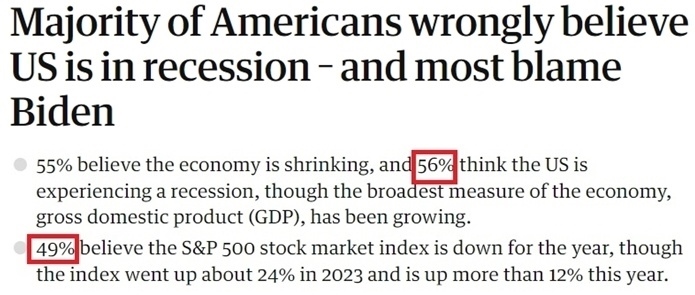 眼下美國的經(jīng)濟(jì)現(xiàn)狀,被經(jīng)濟(jì)學(xué)家們稱為“氛圍衰退”。這個(gè)詞最早由網(wǎng)紅經(jīng)濟(jì)評論員凱拉 斯坎倫創(chuàng)造,用以描述人們對經(jīng)濟(jì)狀況存在的悲觀情緒,即便是表現(xiàn)良好的經(jīng)濟(jì)統(tǒng)計(jì)數(shù)據(jù)也無法消除這種悲觀情緒。