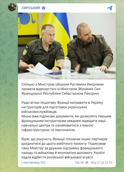 5月27日,瑟爾斯基在Telegram上發(fā)文稱,法國(guó)有意向?yàn)蹩颂m派遣教官,培訓(xùn)烏軍人員。