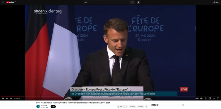 Phoenix在其YouTube頻道上播出的馬克龍演講的完整版本截圖。網(wǎng)傳視頻顯示的音頻內(nèi)容與Phoenix播出的馬克龍?jiān)诘吕鬯诡D進(jìn)行演講時(shí)開篇的音頻一致,且拍攝現(xiàn)場(chǎng)的環(huán)境高度吻合。