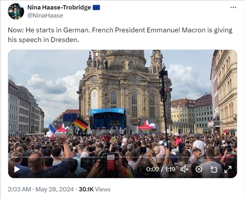 X平臺(tái)用戶@NinaHaase在28日凌晨2點(diǎn)03分發(fā)布的推文截圖,稱“現(xiàn)在,法國(guó)總統(tǒng)埃馬紐埃爾·馬克龍正在德累斯頓發(fā)表演講,他開場(chǎng)用了德語(yǔ)”,沒(méi)有提到法國(guó)軍隊(duì)。