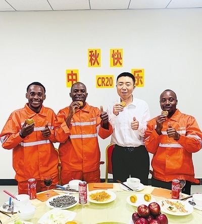 中安員工共同品嘗月餅。中鐵二十局安哥拉國(guó)際公司供圖