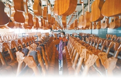工作人員正在制作吉他。趙永章攝
