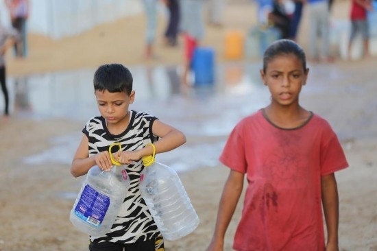 9月26日,在加沙地帶中部城市代爾拜拉赫,當(dāng)?shù)孛癖娬谶\(yùn)水。新華社發(fā)(馬爾萬·達(dá)烏德攝)