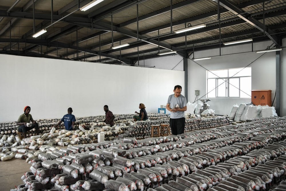 2024年8月13日,在盧旺達(dá)南方省胡耶區(qū)的中國(guó)援盧農(nóng)業(yè)技術(shù)示范中心,菌草專(zhuān)家陳曉斌(右)檢查菌袋。自菌草技術(shù)引入盧旺達(dá)以來(lái),當(dāng)?shù)鼐莓a(chǎn)業(yè)發(fā)展迅速,不僅為市場(chǎng)提供了豐富的食用菌產(chǎn)品,還創(chuàng)造了大量就業(yè)機(jī)會(huì)。