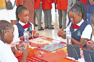 今年2月,在肯尼亞內(nèi)羅畢大學孔子學院舉辦的2024“歡樂春節(jié)之龍騰鼓躍鬧新春”活動上,當?shù)貙W生體驗中國剪紙。本報記者 黃煒鑫攝