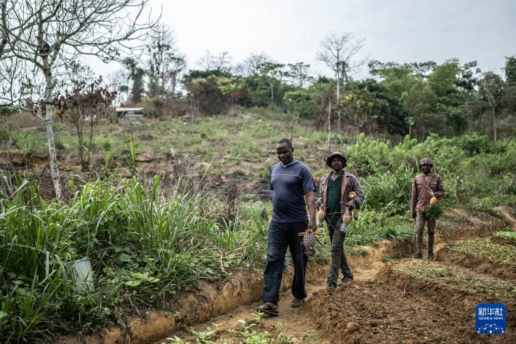 8月1日,農民阿蘭(左)在剛果(布)國家一號公路沿線的菠蘿地內采摘菠蘿。