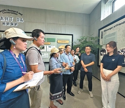 老撾記者在成都大熊貓繁育研究基地對大熊貓保護(hù)工作進(jìn)行采訪。老撾《人民報(bào)》記者 薩納尼·蓬帕迪攝