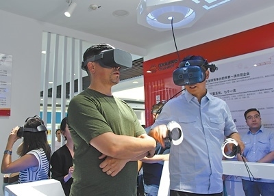 國(guó)際青年代表在玉門(mén)風(fēng)電場(chǎng)VR電力安全生產(chǎn)實(shí)訓(xùn)室體驗(yàn)。 圖為本報(bào)記者趙帥杰攝