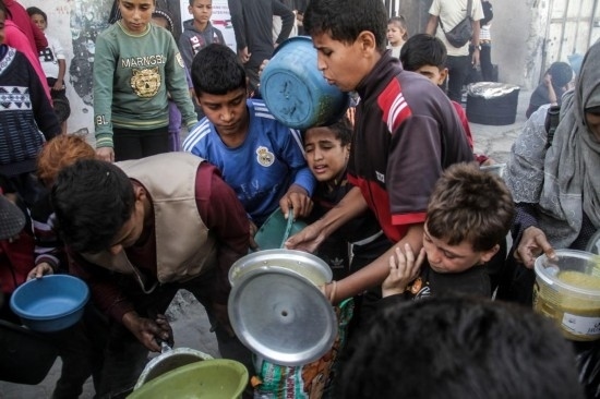 10月23日,人們在加沙地帶北部的加沙城領(lǐng)取救濟(jì)食品。新華社發(fā)(馬哈茂德·扎基攝)