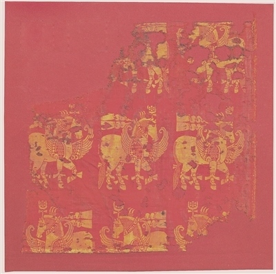 “紅地翼馬紋錦”經向長52厘米、緯向寬51厘米,以紅色經線為地,米白色緯線以斜紋重組織成翼馬圖案,具有明顯的中亞、西亞風格。目前紋錦圖案殘存3排翼馬,中間一排3匹馬右行,上排兩匹(殘損嚴重)和下排3匹均為左行。馬頭戴花狀冠飾,頸系連珠紋帶,連珠紋帶綴有兩條飄帶,從頸后水平狀飄揚。馬胸兩側生翅,翅上鑲有連珠紋,四足及尾部系縛綢帶結,造型別致,充滿浪漫華貴氣息,是典型的薩珊波斯風格。