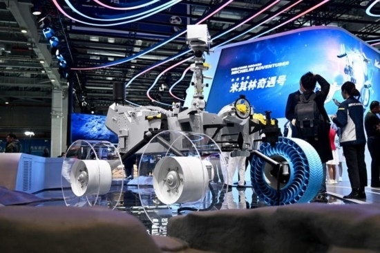 這是11月6日在第七屆進(jìn)博會(huì)汽車展區(qū)拍攝的在亞洲首次亮相的米其林月球探測車輪胎。新華社發(fā)(陳浩明 攝)