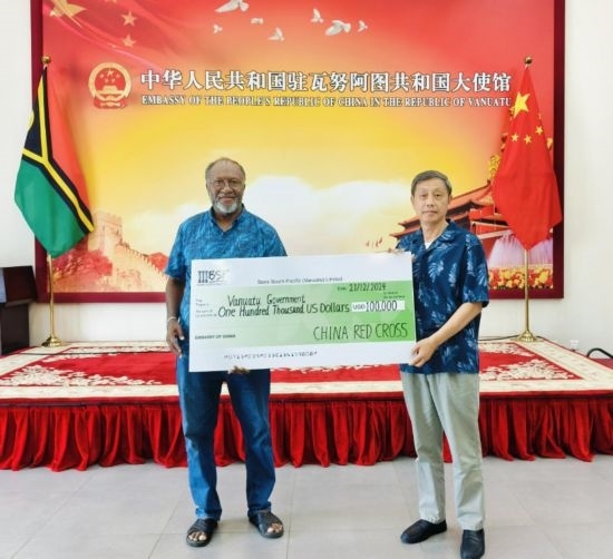 12月21日,中國(guó)駐瓦努阿圖大使李名剛(右)向瓦看守政府總理薩爾維轉(zhuǎn)交中國(guó)紅十字會(huì)向瓦提供的10萬(wàn)美元緊急人道主義現(xiàn)匯援助。中國(guó)駐瓦努阿圖大使館供圖