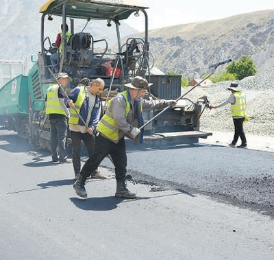 在中塔公路二期建設項目施工現(xiàn)場,工作人員正在鋪設瀝青。
