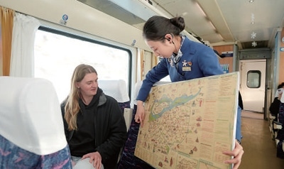 高鐵車廂內(nèi),乘務(wù)員向米婭(左)介紹哈爾濱旅行攻略。