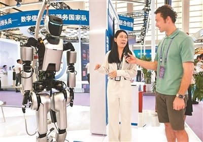 在浙江省寧波國際會(huì)展中心的第十四屆智博會(huì)現(xiàn)場(chǎng),一位外國朋友采訪人形機(jī)器人展商。