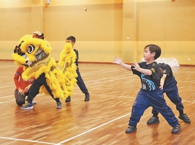 馬來(lái)西亞雪蘭莪州培才二校的學(xué)生在練習(xí)舞獅。