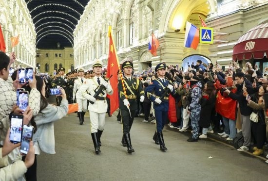 在4月29日和5月3日的夜間彩排中,中國(guó)方隊(duì)隊(duì)列整齊、精神飽滿,甫一亮相便引發(fā)轟動(dòng)。眾多俄羅斯民眾、在俄華僑華人和中國(guó)留學(xué)生聚集在紅場(chǎng)附近,爭(zhēng)相觀看。
