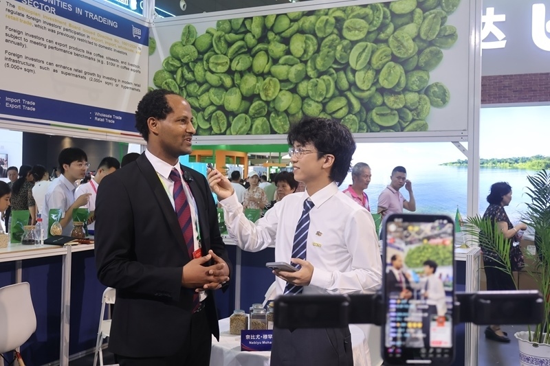 2025年6月14日,在第四屆中國-非洲經(jīng)貿(mào)博覽會(huì)上,埃塞俄比亞駐華公使內(nèi)比尤·穆罕穆德參加現(xiàn)場(chǎng)直播帶貨。新華社記者 周昊瑾 攝