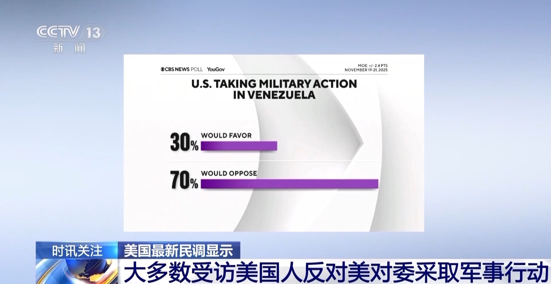 美國(guó)23日的一份最新民意調(diào)查結(jié)果顯示,70%的受訪美國(guó)人反對(duì)美國(guó)對(duì)委內(nèi)瑞拉采取軍事行動(dòng)。關(guān)于美國(guó)在該地區(qū)針對(duì)所謂“販毒船”的攻擊行動(dòng),75%的受訪美國(guó)人認(rèn)為美國(guó)應(yīng)出示證據(jù),證明其攻擊的船只確實(shí)載有毒品。