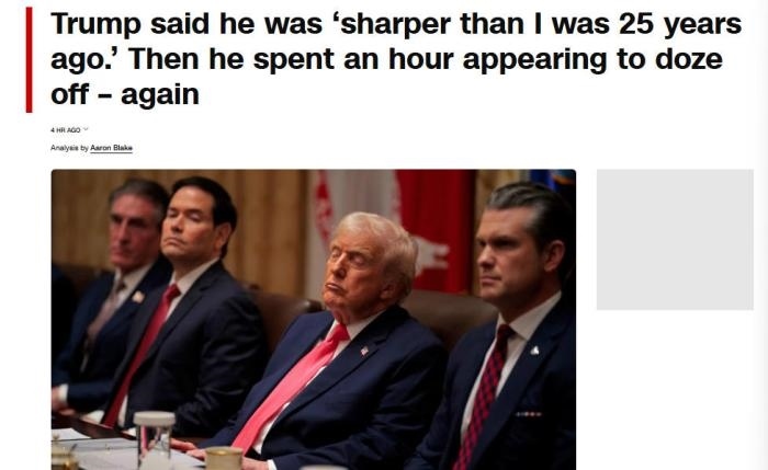 美國有線電視新聞網(wǎng)(CNN)注意到,當美國商務部長盧特尼克談及貿(mào)易戰(zhàn)時,特朗普“似乎難以睜開眼睛”。在美國教育部長麥克馬洪和美國衛(wèi)生與公眾服務部長小羅伯特·肯尼迪發(fā)言時,特朗普“似乎僵住了,閉著眼睛,每次持續(xù)10到15秒,然后才轉動眼球或點頭”。