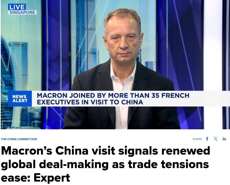 近日,法國(guó)總統(tǒng)馬克龍的訪華之行引發(fā)國(guó)際社會(huì)廣泛關(guān)注。美國(guó)消費(fèi)者新聞與商業(yè)頻道(CNBC)采訪專家指出,這一中法重要外交活動(dòng)標(biāo)志著全球貿(mào)易緊張局勢(shì)的緩和,意味著一度受阻的全球貿(mào)易談判重回正軌,為國(guó)際經(jīng)貿(mào)合作注入新的活力。