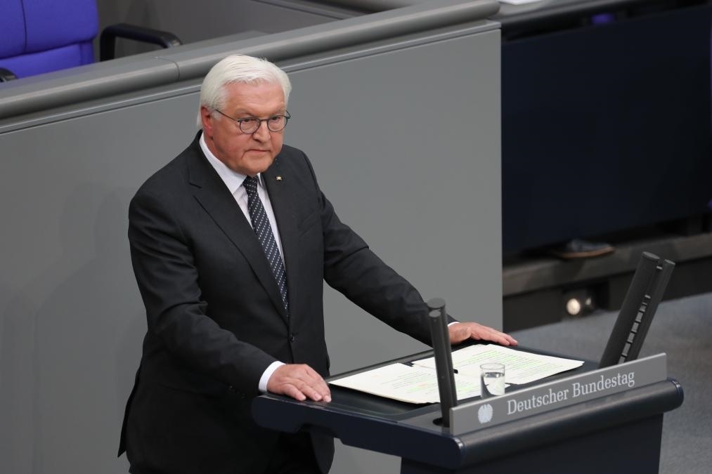 5月8日,德國總統(tǒng)施泰因邁爾在首都柏林國會(huì)大廈舉行的紀(jì)念活動(dòng)上致辭。新華社記者杜哲宇攝