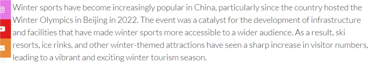 文章說,自2022年北京冬奧會成功舉辦以來,冰雪運動在中國越來越受歡迎。冬奧效應帶動了基礎設施的完善,讓更多人得以接觸冰雪項目。如今,滑雪場、冰場和其他冬季主題景點客流量大幅增長,造就了充滿活力、令人興奮的冰雪旅游季。