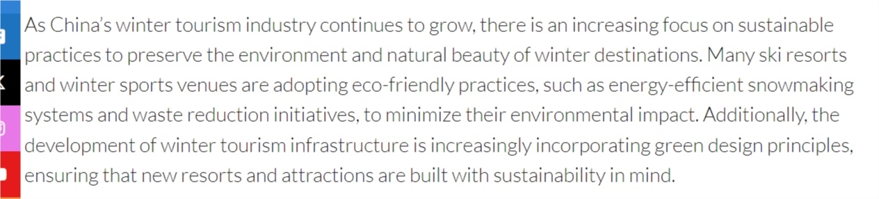 文章還說,隨著中國冬季旅游產業(yè)的不斷壯大,可持續(xù)發(fā)展理念、環(huán)保實踐也日益受到重視。中國正成為越來越有吸引力的冬季旅游目的地。