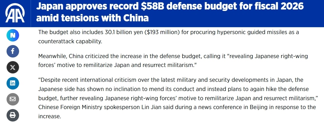 日本政府12月26日批準2026財年(2026年4月至2027年3月)預(yù)算案,其中防衛(wèi)預(yù)算超9萬億日元,再創(chuàng)歷史新高。其展現(xiàn)出的日本負面軍事動向,受到國際媒體關(guān)注。