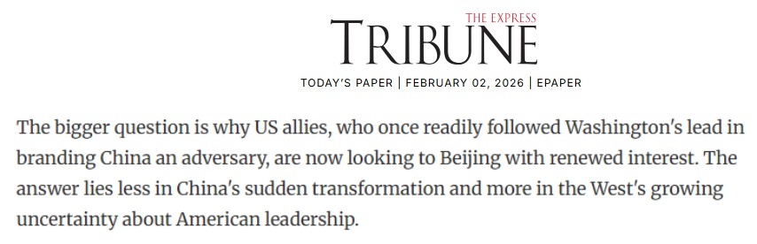 巴基斯坦《論壇快報(bào)》2日的一篇文章指出,為何曾緊跟華盛頓將中國(guó)視為“對(duì)手”的西方盟友們,如今對(duì)中國(guó)重燃興趣?答案不是中國(guó)的突然轉(zhuǎn)變,而是西方對(duì)美國(guó)不確定性日益加深的疑慮。