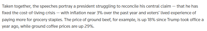 路透社指出,過去一年美國通脹率維持在接近3%的水平,但多項日常消費品價格仍在上漲。數(shù)據顯示,過去一年中,碎牛肉價格上漲約18%,咖啡粉價格上漲約29%。