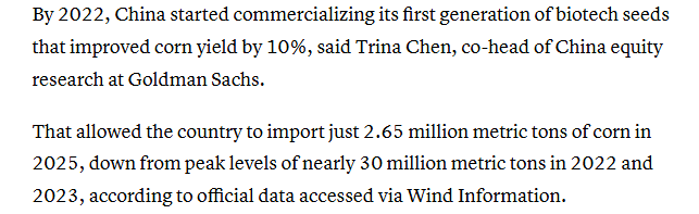 報(bào)道還稱,中國在農(nóng)業(yè)研究與開發(fā)方面投入巨大,2019年至2021年其公共部門在這方面的支出大約是美國的兩倍。報(bào)道援引高盛中國股票研究部聯(lián)席主管的觀點(diǎn)稱,到2022年,中國已開始將第一代生物育種產(chǎn)業(yè)化應(yīng)用,這些種子使玉米產(chǎn)量提高了10%。報(bào)道還援引萬得資訊獲得的官方數(shù)據(jù)稱,這使得中國在2025年的玉米進(jìn)口量僅為265萬噸,遠(yuǎn)低于2022年和2023年近3000萬噸的峰值水平。