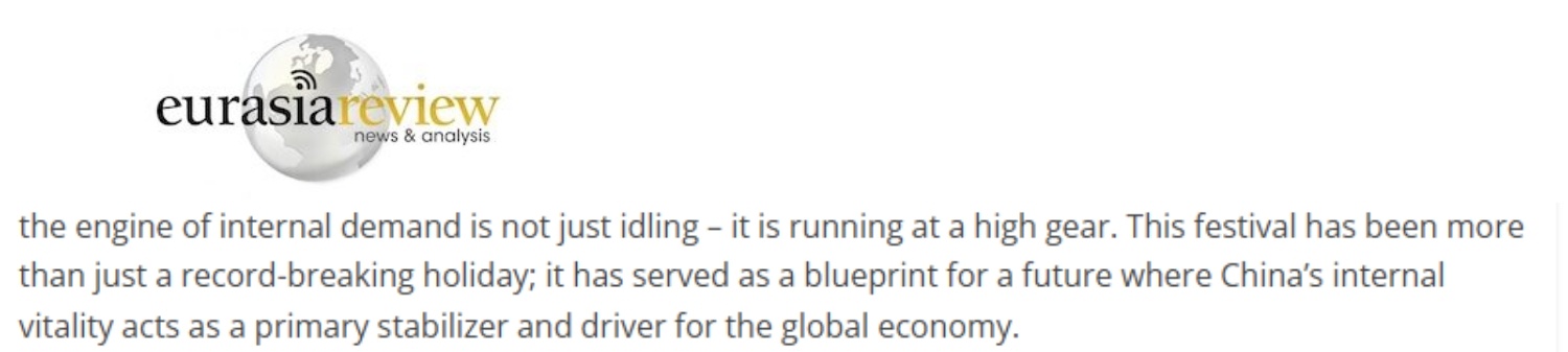 文章最后說(shuō),春節(jié)消費(fèi)熱潮表明,內(nèi)需引擎非但沒(méi)有空轉(zhuǎn),反而在高速運(yùn)轉(zhuǎn)。這個(gè)春節(jié)的意義不僅僅在于其破紀(jì)錄的假期數(shù)據(jù),而是在于它繪制了一幅未來(lái)藍(lán)圖:中國(guó)的內(nèi)在活力將成為全球經(jīng)濟(jì)的主要穩(wěn)定器和驅(qū)動(dòng)力。