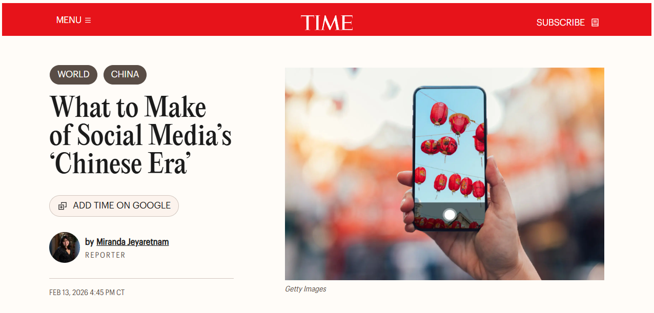 美國《時(shí)代》周刊網(wǎng)站2月13日的一篇文章稱,伴隨著今年的中國新年,社交網(wǎng)絡(luò)上介紹中國文化的內(nèi)容不少。這是一種新的趨勢,美國社交媒體用戶視自己為“中國人”,擁抱“Chinese era”(中國時(shí)代)或者“Chinamaxxing”(極致中國化)。觀察家分析,這一趨勢反映了隨著中國的開放和軟實(shí)力的提升,人們對(duì)中國越來越著迷。