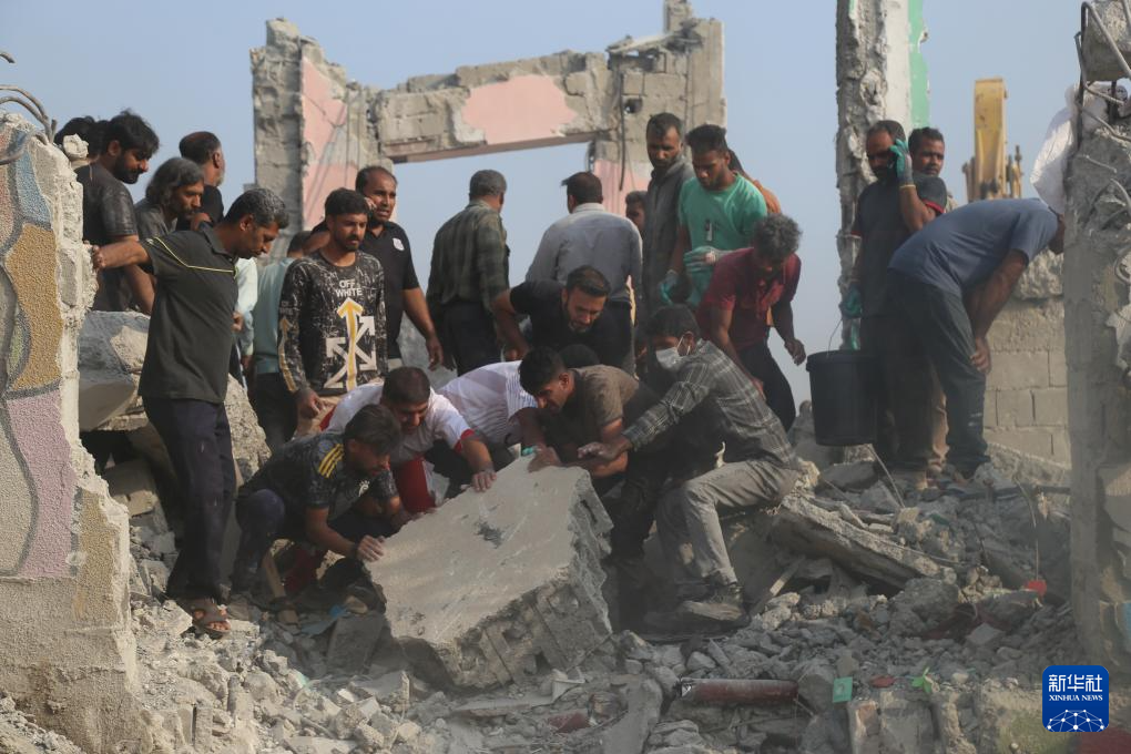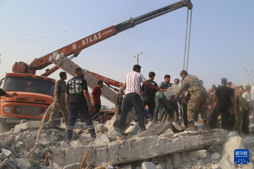 2月28日,在伊朗米納卜市一所被襲擊的小學,救援人員和當?shù)鼐用裨噲D從廢墟里營救傷員。