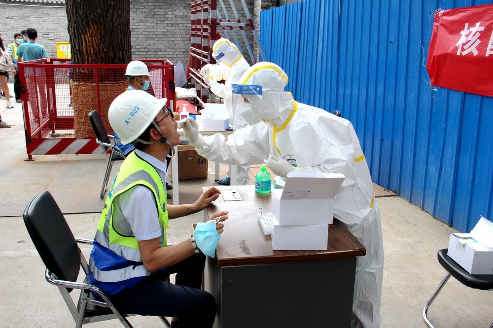 6月15日至17日,中建三局北京公司在京1042名職工做完核酸檢測(cè),同時(shí)公司邀請(qǐng)專(zhuān)業(yè)機(jī)構(gòu)為在建項(xiàng)目的上萬(wàn)名勞務(wù)工人、安保及物業(yè)管理人員提供上門(mén)核酸檢測(cè)。新華社發(fā)(柯玉乾攝)