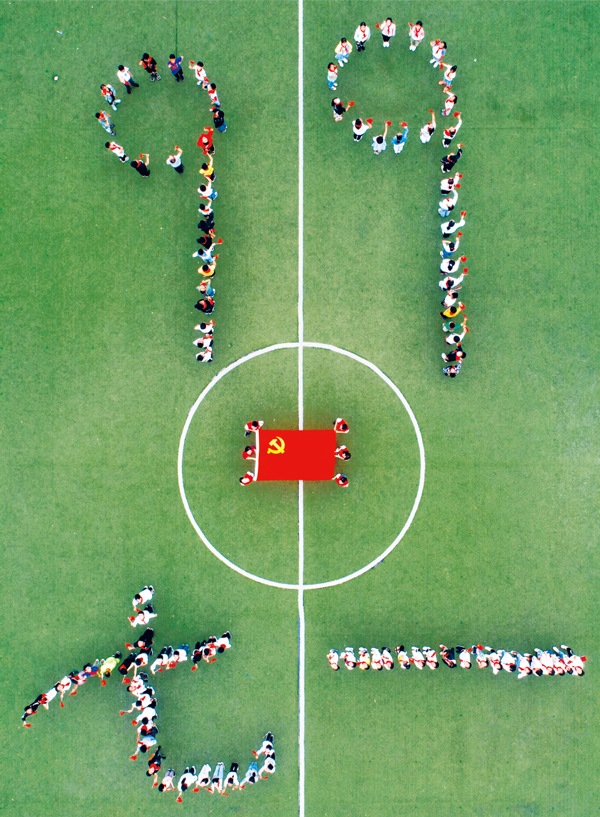 2020年6月30日,江蘇省泰州市大馮中心小學(xué)開展“童心向黨迎七一”主題班會(huì),通過給學(xué)生上黨課、講黨史等方式,讓學(xué)生了解黨的光輝歷程,迎接中國共產(chǎn)黨建黨99周年。圖為活動(dòng)中擺出的“七一”、“99”和黨旗的組合圖案。中新社發(fā)湯德宏/攝