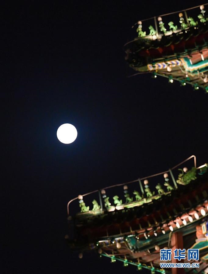 10月1日在北京前門商業(yè)街拍攝的木雕龍頭和月亮。當(dāng)日是農(nóng)歷八月十五,傳統(tǒng)的中秋節(jié)與國慶節(jié)相遇,共迎圓月。新華社記者李賀攝