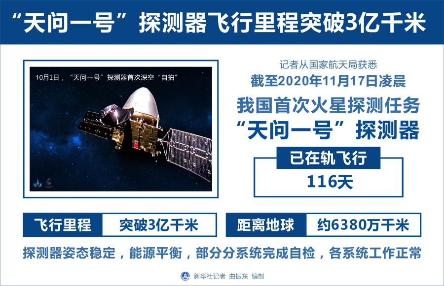 新華社北京11月17日電(記者胡喆)記者從國家航天局獲悉,截至2020年11月17日凌晨,我國首次火星探測任務(wù)“天問一號(hào)”探測器已在軌飛行116天,飛行里程突破3億千米,距離地球約6380萬千米。探測器姿態(tài)穩(wěn)定,能源平衡,部分分系統(tǒng)完成自檢,各系統(tǒng)工作正常。