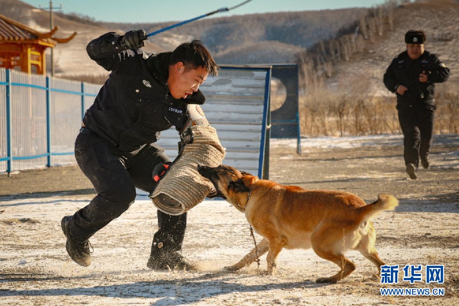 警犬訓(xùn)導(dǎo)員和警犬進(jìn)行撲咬訓(xùn)練。新華網(wǎng)發(fā)(包青松攝)