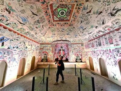 2021年9月17日,參觀者在北京故宮展覽的敦煌莫高窟第285窟復制洞窟內參觀。新華社發(fā)
