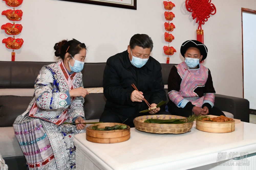 2021年2月3日至5日,習(xí)近平來到貴州考察調(diào)研,看望慰問各族干部群眾,向全國各族人民致以美好的新春祝福。這是3日下午,習(xí)近平在畢節(jié)市黔西縣新仁苗族鄉(xiāng)化屋村苗族村民趙玉學(xué)家,同趙玉學(xué)一家邊聊家常邊制作當(dāng)?shù)貍鹘y(tǒng)節(jié)日食品黃粑。