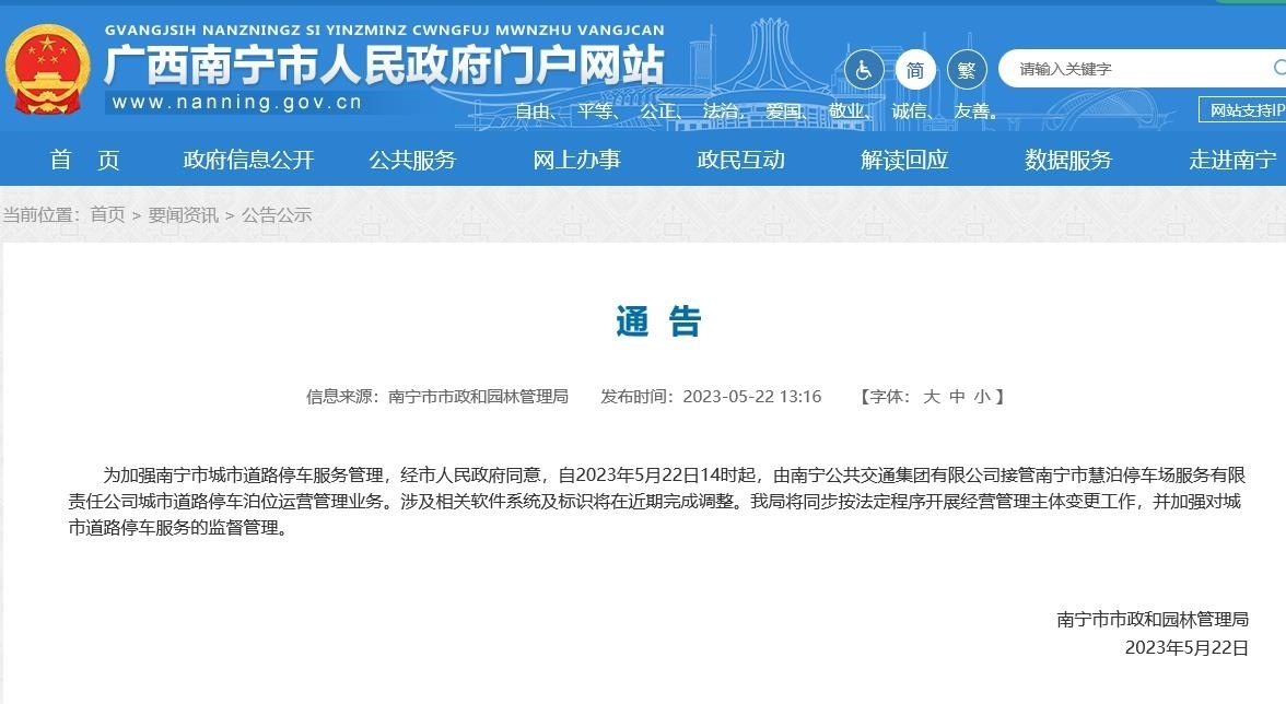 5月22日14時起 南寧公交集團接管慧泊停車運營管理業(yè)務(wù) 經(jīng)市人民政府同意,自2023年5月22日14時起,由南寧公共交......