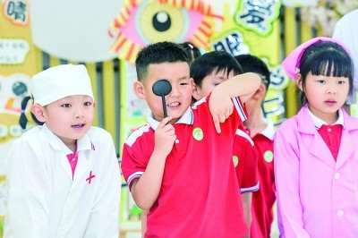 浙江湖州市長興縣開發(fā)區(qū)中心幼兒園內(nèi),孩子們在進行視力檢測。吳拯攝/光明圖片