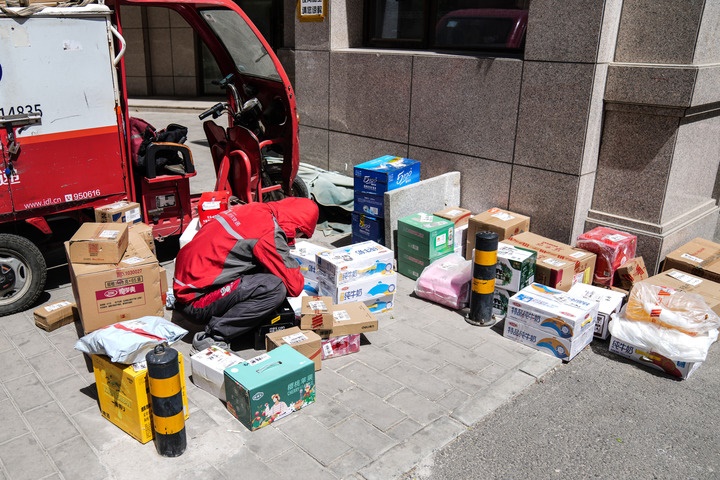 2022年4月26日,在北京市一小區(qū)門(mén)口,快遞員在整理貨品準(zhǔn)備投遞。新華社記者彭子洋攝