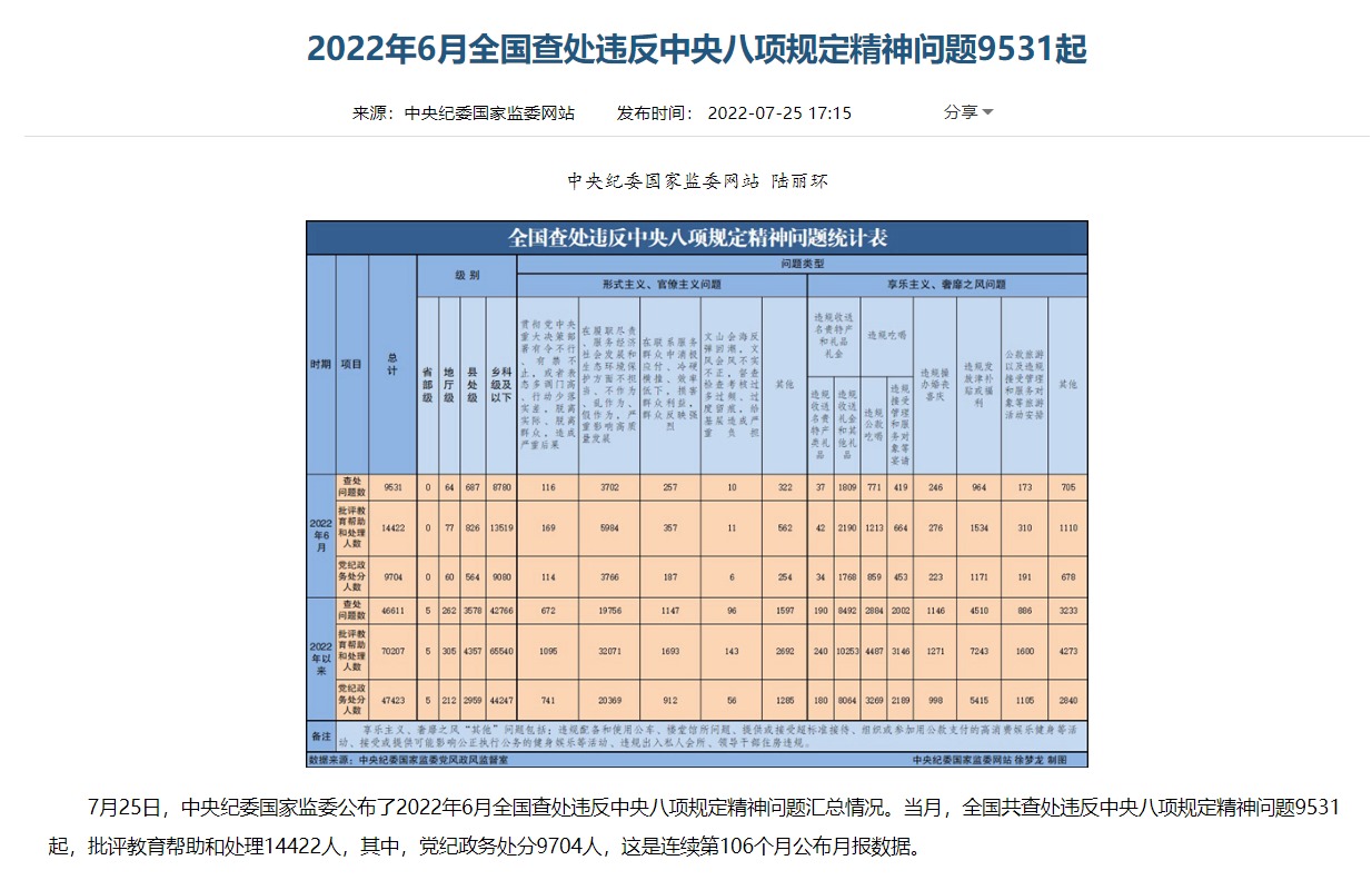 從公布的月報數(shù)據(jù)看,當(dāng)月(6月),全國共查處違反中央八項規(guī)定精神問題9531起,批評教育幫助和處理14422人,其中,黨紀政務(wù)處分9704人。
